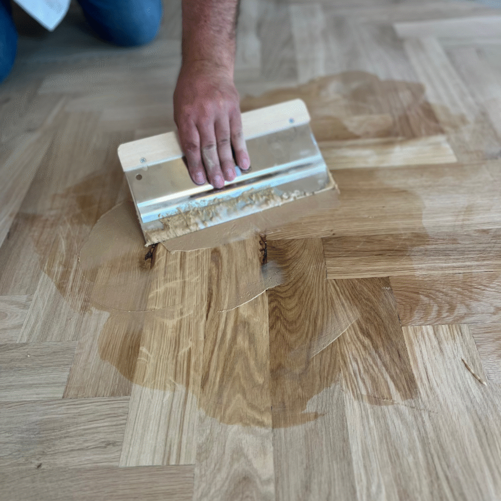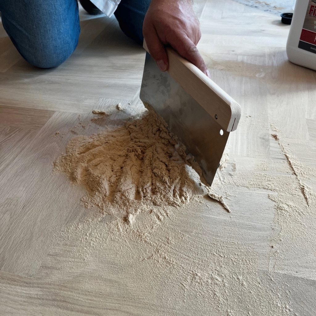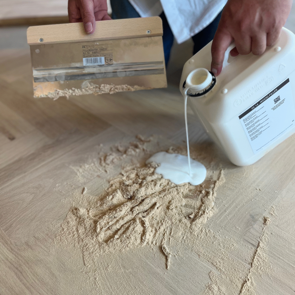 Zmiešava sa s brúsnym prachom z konečného brúsenia, aby sa čo najlepšie zhodoval s farbou podlahy.